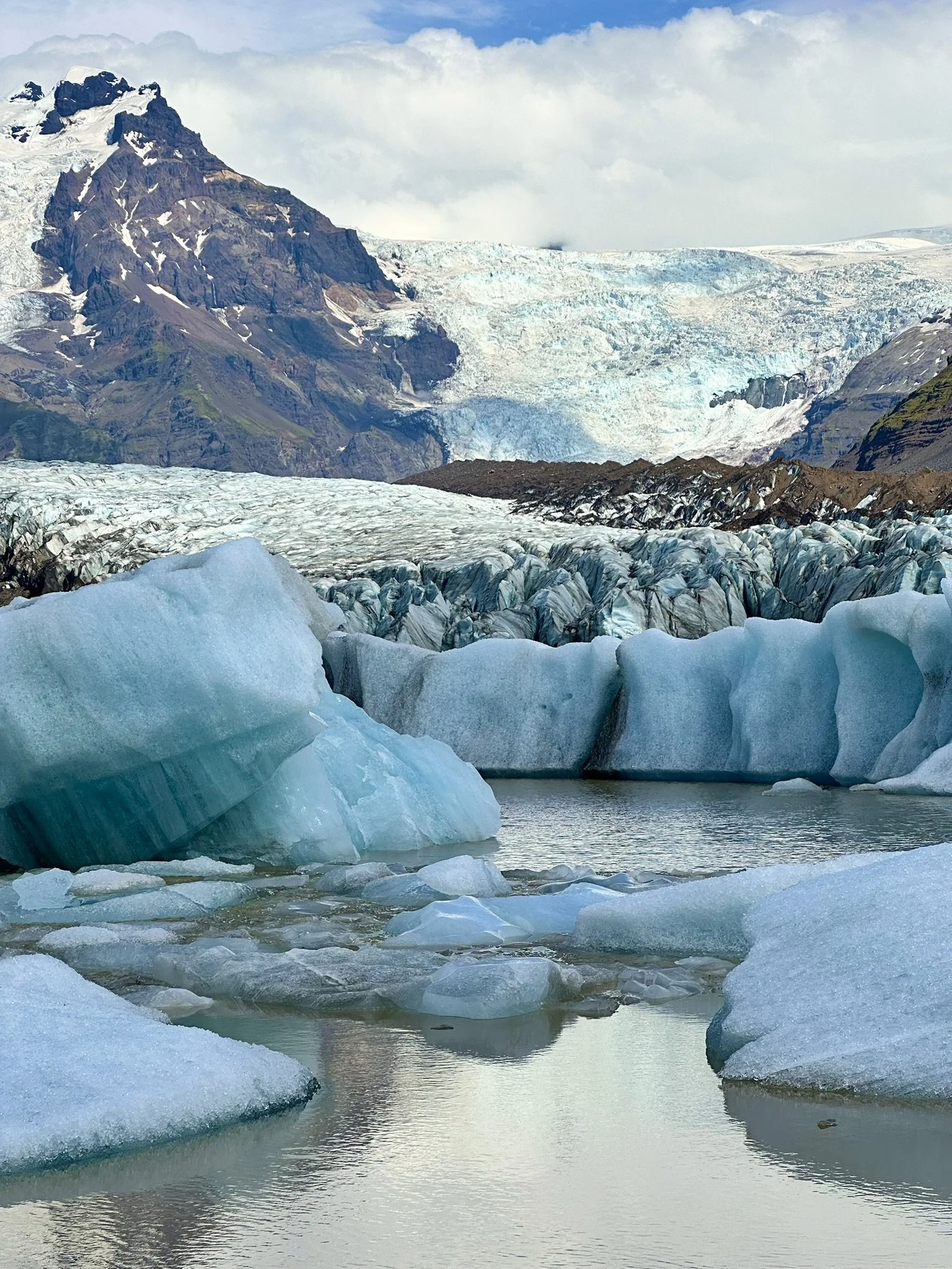 Svinafellsjökull's dramatic scenery and deep crevassed landscape is an outlet glacier of Vatnajökull, the largest glacier in Europe, which covers eight percent of Iceland's landmass. The black crevasses, highlighted with black volcanic ash, contrast with the glacier's bright blue ice structure. This beautiful, chiseled glacier first gained recognition for its role in Interstellar and Batman Begins. In the Game of Thrones movies, the "North of the Wall" refers to a frozen wilderness region beyond a massive ice structure, primarily filmed at Svinafellsjökull glacier.