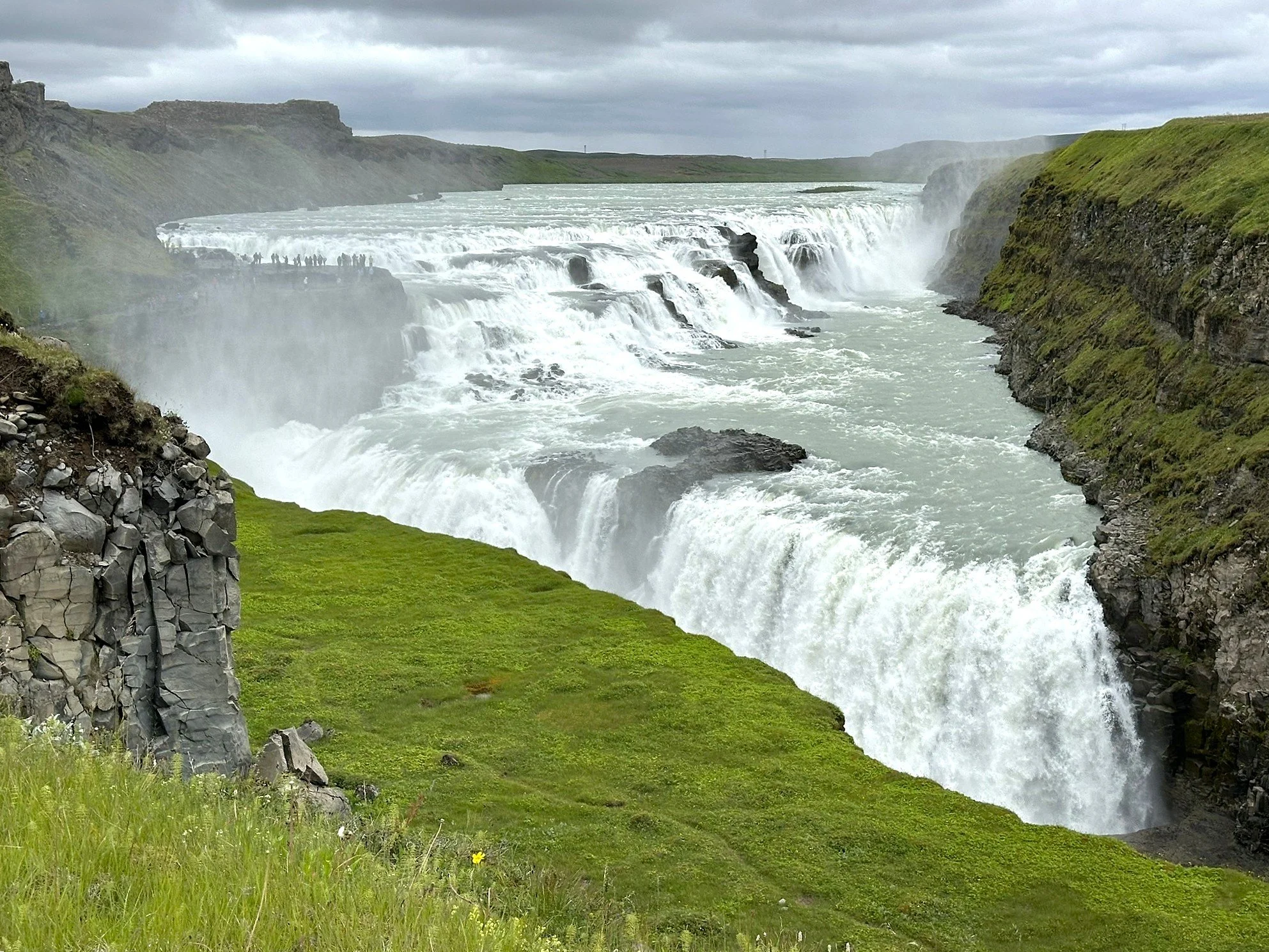A stunning and powerful two-tiered waterfall cascading into a rugged canyon. On a sunny day, which apparently is rare in Iceland, Gullfoss has a golden hue, hence the name "Golden Falls".