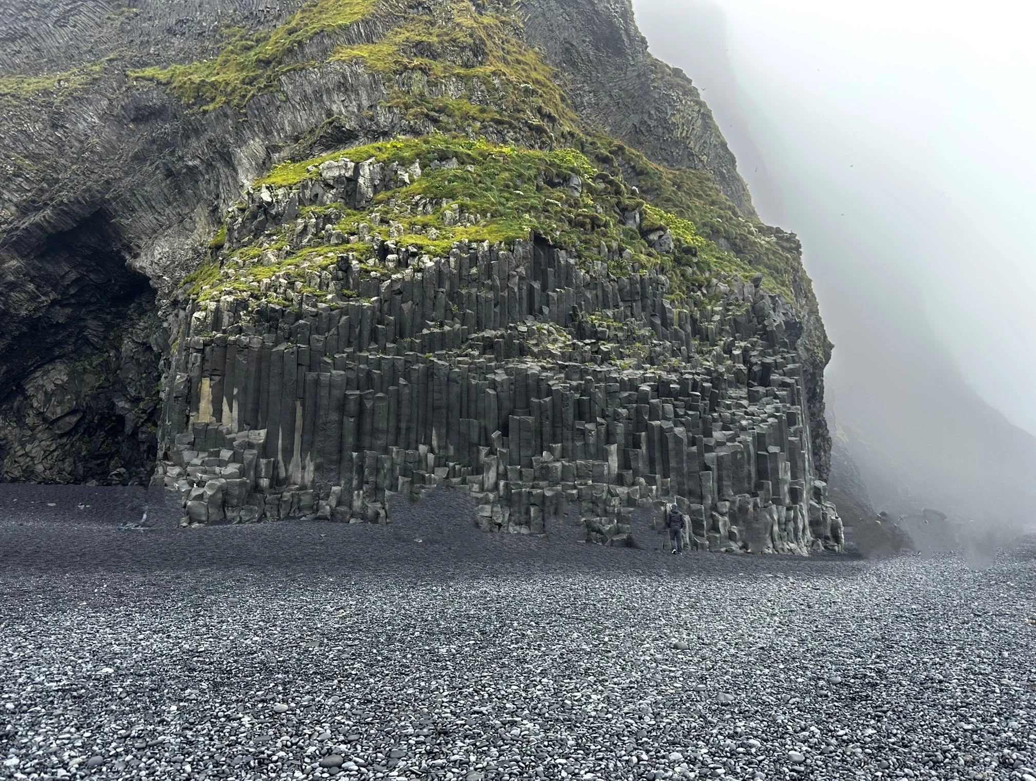 Beach of black volcanic sands and smooth pebbles with unique hexagonal basalt pillar formations. Halsanefshellir Cave is a popular filming location, appearing in Game of Thrones, Star Trek Into Darkness, Star Wars: Rogue One, and Noah.