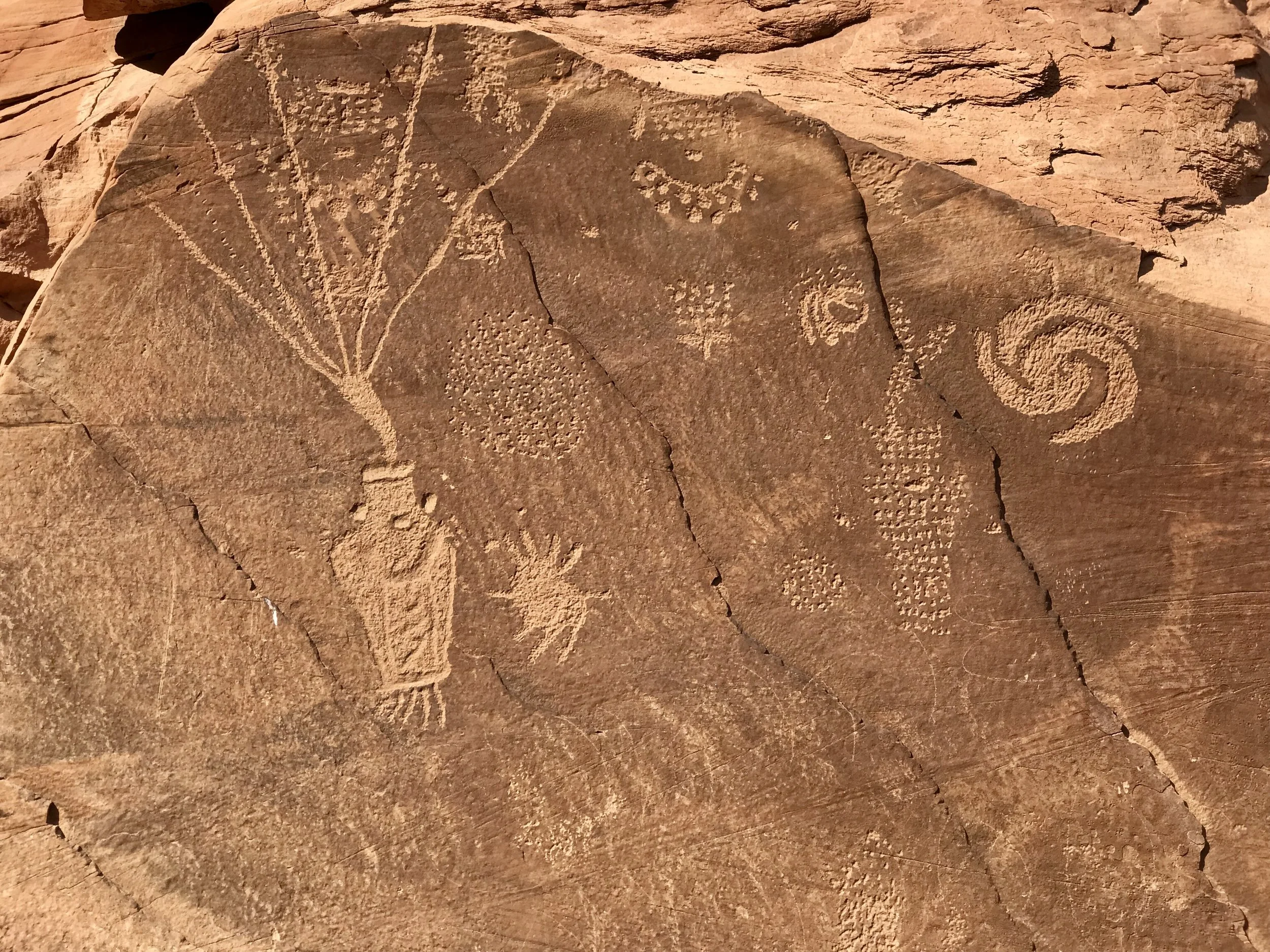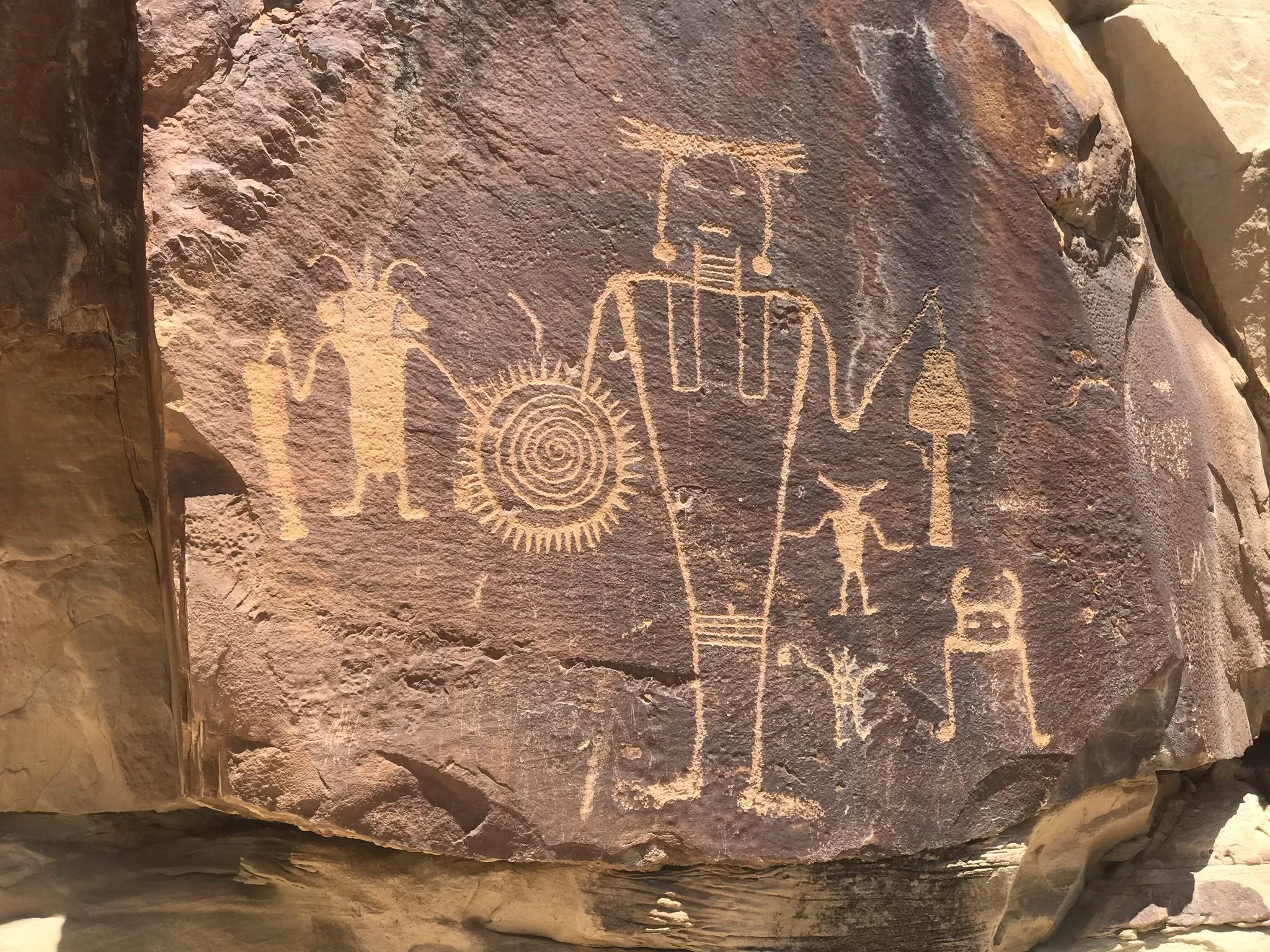 The petroglyph and pictograph sites reveal the connections of Indigenous people to this land and are credited to the Fremont peoples, who lived in the area between 300 and 1300. The “Vernal Classic Style” is characterized by humanlike figures with trapezoidal bodies and broad shoulders that taper down to thin waists. This style also includes many animal-like figures, including bighorn sheep, elk, deer, snakes, lizards, and abstract animal-like shapes. Additionally, abstract or geometric designs, such as circles, spirals, and lines, are also common.